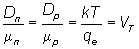 en la que Dn y Dp son las difusividades de electrones y huecos, mn y mp las movilidades de electrones y huecos, k la constante de Boltzmann (1,38066·10-23 J/K), T la temperatura absoluta y qe la carga del electrón. De este modo, a 300 K el valor de VT (potencial de temperatura) es de 26 mV.