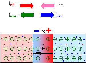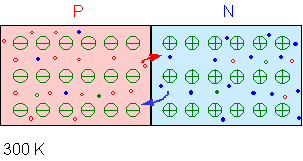 En una unión entre un semiconductor p y uno n, a temperatura ambiente, los huecos de la zona p pasan por difusión hacia la zona n y los electrones de la zona n pasan a la zona p.