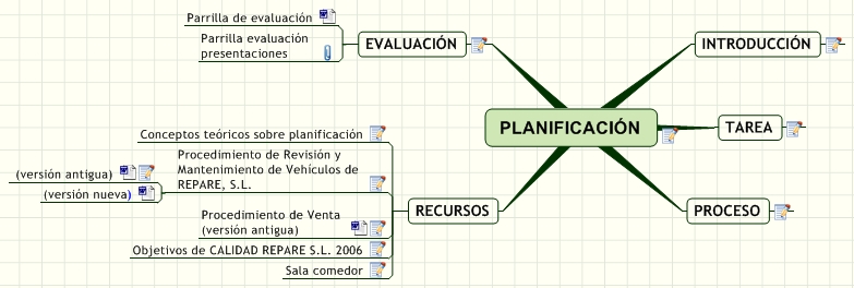 INTRODUCCIÓN TAREA PROCESO RECURSOS Conceptos teóricos sobre planificación Procedimiento de Revisión y Mantenimiento de Vehículos de REPARE, S.L.  (versión antigua) PG-09-MM.7_RevisionYManteniemientoFormatoNUEVO.doc Procedimiento de Venta (versión antigua) Objetivos de CALIDAD REPARE S.L. 2006 Sala comedor EVALUACIÓN parrilla_de_evaluacion.doc Parrilla evaluación presentaciones