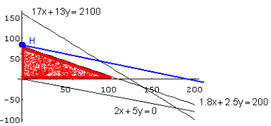 H pertenece a la recta 1.8 x+2.5 y=200, cumplirá: x=0, y=200/2.5=80