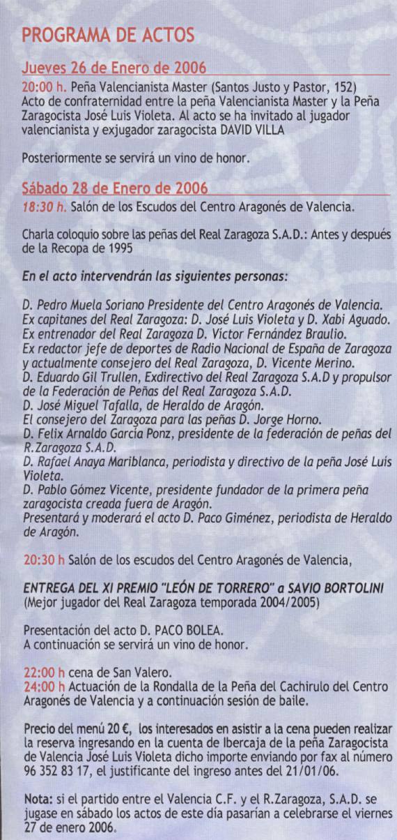 Con el deseo de que hayas pasado unas felices navidades, nos ponemos en contacto contigo para pedirte tu colaboración y asistencia a los actos que hemos organizado ante la visita de nuestro Real Zaragoza a Valencia el próximo 28 de enero. Como podéis ver en el díptico de arriba, empezaremos el 26 en la Peña Valencianista Máster y el día 28 continuaremos en el Centro Aragonés. En esta ocasión, coincidimos con la cena de fin de mes de la Peña El Cachirulo, de tal manera que vamos a realizar la cena conjuntamente, así como con las Peñas Zaragocistas de Barbastro y Tardienta, que vendrán a visitarnos.