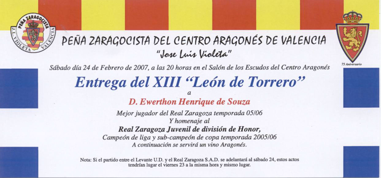 ENTREGA DEL "LEÓN DE TORRERO" Y ACTOS PARALELOS. Estimados socios: Como sabéis, está previsto que el próximo 25 de febrero nuestro Real Zaragoza visita al Levante. El sábado 24 (el día anterior a la disputa del partido), entregaremos el galardón "León de Torrero" a D. Ewerthon Henrique de Souza. Así mismo, habrá una placa de homenaje al Real Zaragoza juvenil, campeón de liga la pasada temporada. Pediremos la presencia de Víctor Fernández y de algún jugador más. Después de estos actos y concluido el vino aragonés, celebraremos una cena en el Centro Aragonés. El presidente D. Eduardo Bandrés Moliné nos comunicó que asistiría. Por ello, os pedimos que asistáis a la cena. Cuantos más seamos, más arropados se sentirán. El precio del menú es 19€, que podéis pagar en Secretaría del Centro Aragonés o los días del partido en la Peña (día 11 contra el Mallorca y el 17 contra el Villarreal). La fecha tope para apuntarse es el lunes, 19 de febrero. Así mismo, si estáis interesados en que la Peña proporcione entradas para el partido, el procedimiento es el mismo que para la cena, dando 20€ de señal de entrada. PASADA ESTA FECHA NO SE PODRÁN ACEPTAR ENCARGOS DE ENTRADAS NI RESERVAS PARA LA CENA. Este año es el 75 Aniversario del Real Zaragoza. Por ello, vamos a confeccionar unos polos que tendrán subvención de la peña. Si estáis interesados, podéis hacer la reserva dando la talla y una señal de 15€.