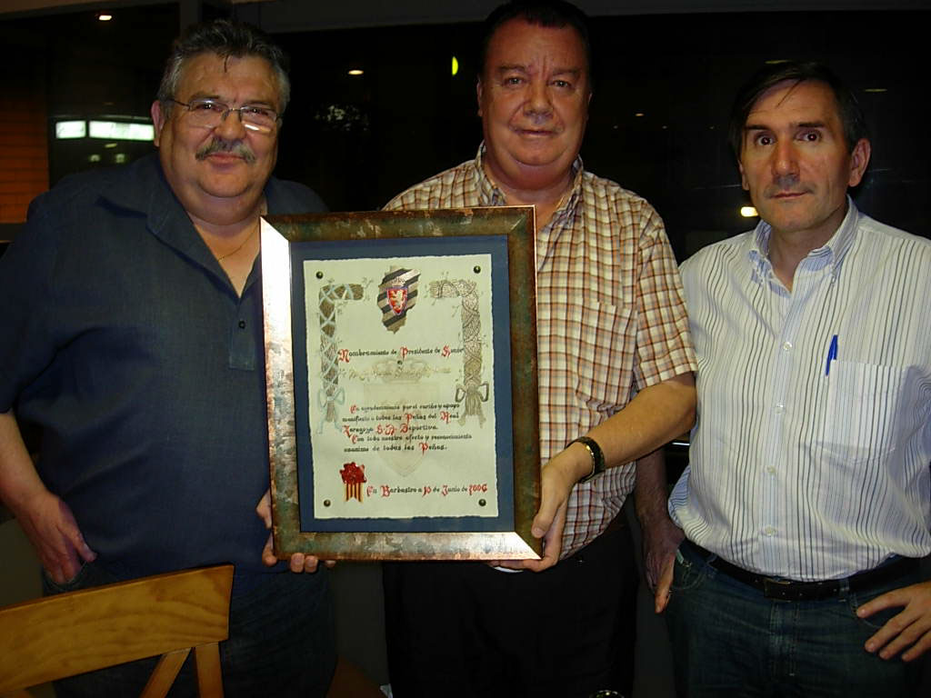 Con el presidente de la Federación de Peñas y el Presidente de la Peña de Barbastro, con el título de presidente de honor a Don Alfonso Solans Solans.