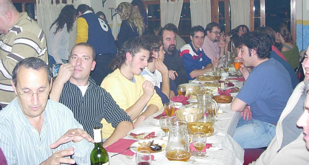 PARTIDO HOMENAJE A JOSÉ MARÍA DE JAIME CON CENA POSTERIOR. (más información en " equipo de fútbol sala" y en "historia de la peña ") El pasado viernes, 18 de noviembre, en el Pabellón de San Isidro, tuvo lugar un partido de fútbol sala en homenaje a José María de Jaime. Mientras revelamos las fotos del acto, vayan por delante estas líneas para dejar constancia del buen rato que pasamos. José María de Jaime, jugador y alma mater del equipo de fútbol sala de nuestra peña durante muchos años, y boticario y profesor en sus ratos libres, se retiraba del deporte activo, en el que tantas glorias y galardones ha conseguido. Buena excusa para juntarnos y sudar un poco. En un equipo, Cirujeda de Perales, los Forestales de Alfambra, Héctor, que sigue estando en tan buena forma como siempre y Paco, de Frías de Albarracín, que sigue estando en tan mala forma como siempre. En el otro equipo, Luis Mi, directamente llegado del deporte de élite de Rillo, Casanova, luchador y fuerte, Boro de Fuentes Claras, al que claramente sobran unas cuantas arrobas, Ferreruela, jugando con la seriedad que le caracteriza y el homenajeado, por el que no parecen pasar los años. Luego se incorporarían los jóvenes Chimo y Jesús. En la banda, algunos jugadores lesionados, como Pepe de Calamocha y Jaime de Perales, a los que Pascual de Torrijo les llevaba las cervecicas. También contábamos con la presencia de Pablo Gómez y de un atractivo elenco de bellas señoritas, novias de los jugadores (Ana, Patricia, Laura y Carmen). Como puede verse, masiva presencia aragonesa y zaragocista. Después de un breve tercer tiempo en el mismo pabellón (cerveza Super-Bok y cacahuetes), nos trasladábamos al bar Seytu (zona Mezquita) donde además del homenaje a José María, celebramos el cumpleaños de Luis Mi que, al parecer, cumplía treinta y algo; pero sigue aparentando dieciséis, como toda la vida. No rompimos casi nada. Buen ambiente aragonés y buenas tapas. Saltó entonces la sorpresa. Emocionado por los regalos, por el ambiente y quizá por el vino, José María hacía las siguientes declaraciones: "¡¡ Pues no me voy a retirar !!" Para quitarnos el susto, la fiesta se prolongó hasta altas horas de la noche en un pub cercano, donde se puede beber cerveza Ámbar y está terminantemente prohibido jugar a la morra. Si no fuera por estos raticos...