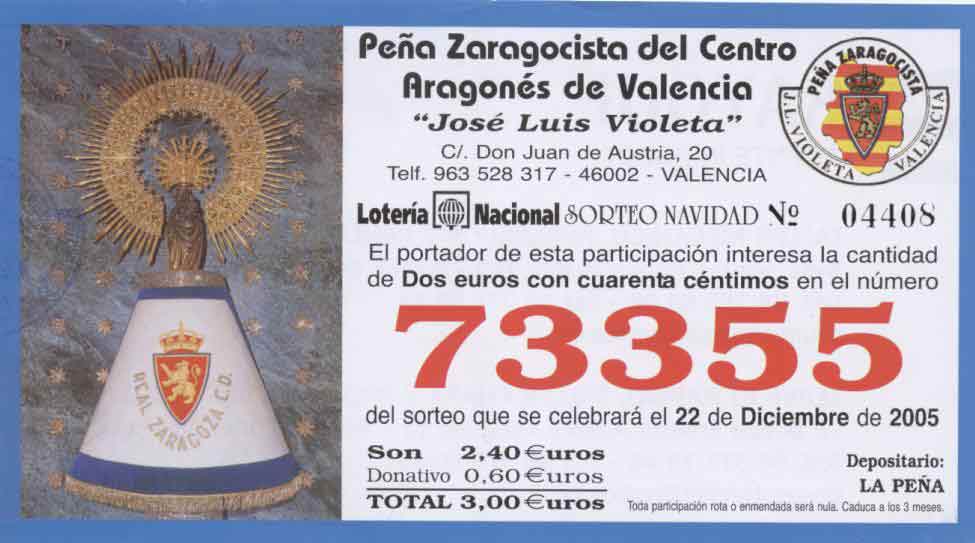 RECORDATORIO: NOTICIAS DE LA PEÑA. LOTERIA DE NAVIDAD: Fecha última para liquidar lunes 12 de Diciembre. Te rogamos la ingreses en la cuenta de Ibercaja, peña Zaragocista de Valencia, dando tu nombre y apellidos para que conste en el ingreso. Tenemos lotería del niño voluntaria. Las guardias de la apertura de la peña, para los meses de enero y febrero son: