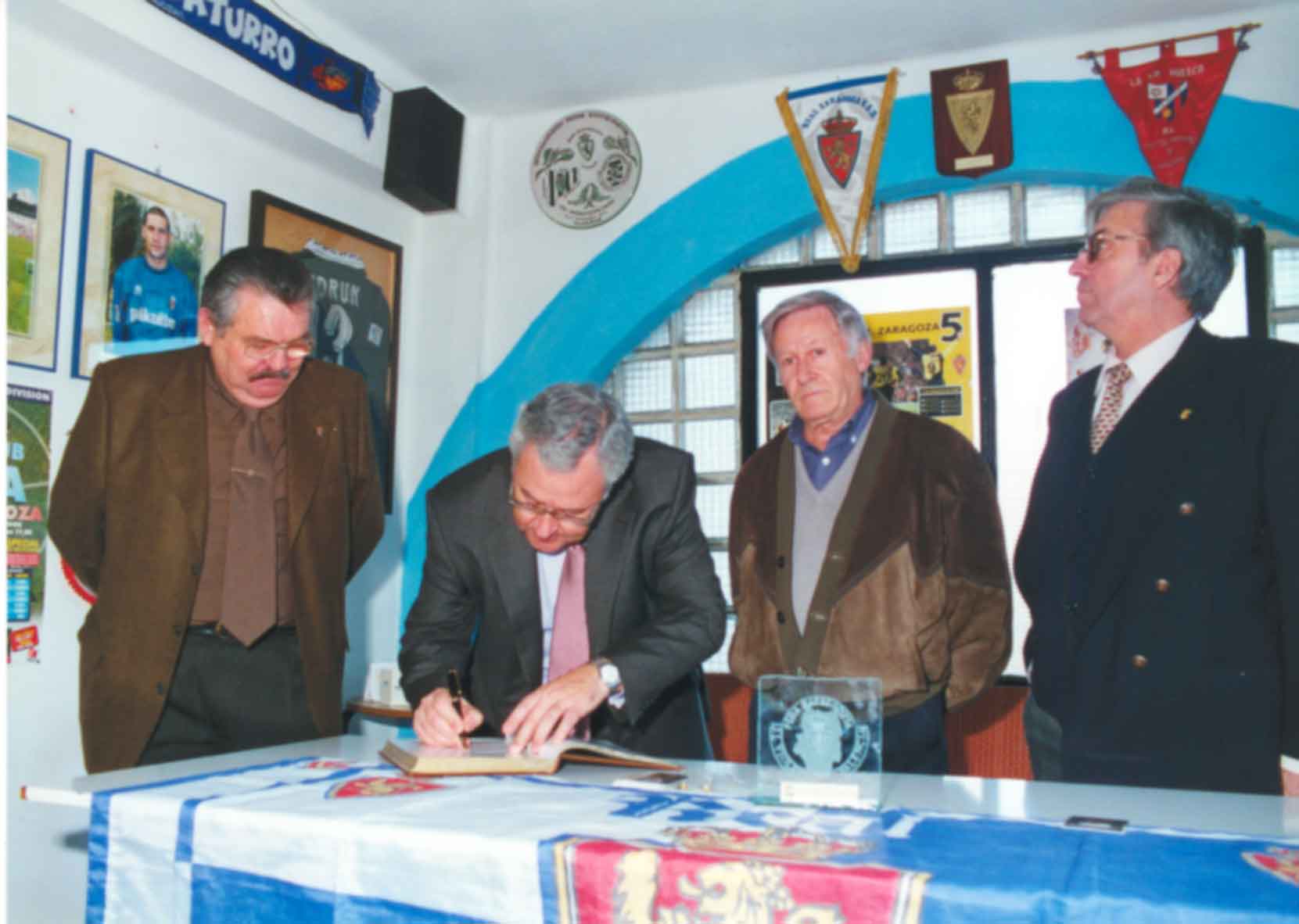 Coincidiendo con la visita del equipo a Valencia en 1995, entrega de un recuerdo a Eduardo Gil Trullén, directivo del Real Zaragoza, están presentes A. Lucea, del Heraldo de Aragón y José Luís Violeta.