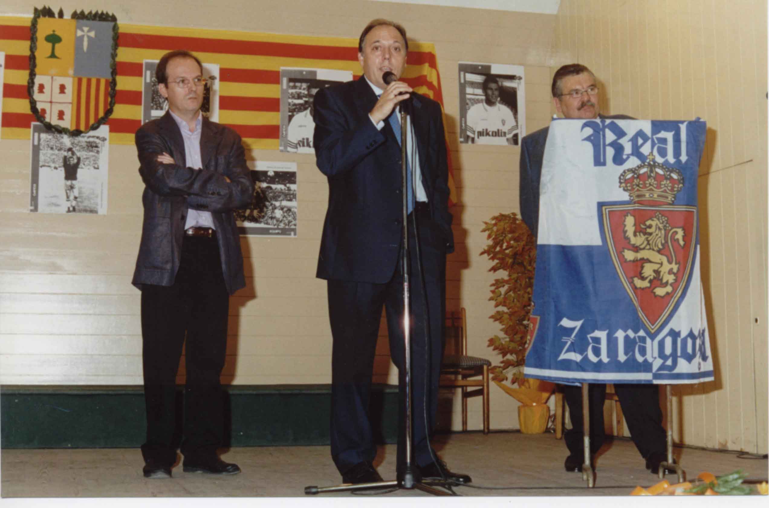 Mayo del 2000: Antonio Calvo Pedrós (fotógrafo del Real Zaragoza y autor de muchas de las fotos usadas en esta página) Francisco Checa y José Luis Violeta, junto con algunos de los fundadores de la Peña. Las damas del Centro Aragonés aportan un poco de gracia a la foto.