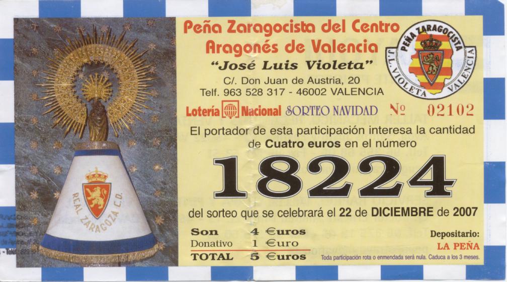La cena de Navidad de la Peña tendrá lugar el viernes, 14 de diciembre en el Bar Hermanas Bau, en la C/Miguel Quiles,11 de Mislata (Valencia), detrás del edificio de la Seat de la Avenida del Cid. El precio es 10€ para los socios y 25€ para los no socios. Como siempre, habrá obsequios para todos. Rogamos confirméis lo antes posible la asistencia, pues las plazas son limitadas. La fecha límite para reservar plaza es el 2 de diciembre, en el 629527397 o en pzvioleta@yahoo.es Al día siguiente, tendrá lugar en el Centro aragonés la tradicional fiesta de reyes. Confirmad vuestra asistencia para que los niños tengan su regalo. Ese mismo día, se celebra la comida de Navidad del Centro. Se puede reservar sitio en la secretaría del centro: 963528317 Durante este mes se cobrará a través del banco la segunda parte de la cuota de la temporada (36€) más 6€ de lotería de la Agrupación de Peñas (nº 61442) (obligatoria para todos los peñistas del R. Zaragoza). Por favor, comunicad si habéis cambiado de cuenta en el banco. Ya os informaremos del desplazamiento a Valladolid en el puente de San Vicente. Hay también lotería del niño, cuya venta es voluntaria. |