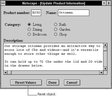 <P><INPUT TYPE="reset" VALUE="Clear Form">Text objects, a Select object, and three radio buttons; all of these objects have default values. The form also has a reset button with the text "Defaults" on its face. If the user changes the value of any of the objects and then clicks the Defaults button, the original values are restored.