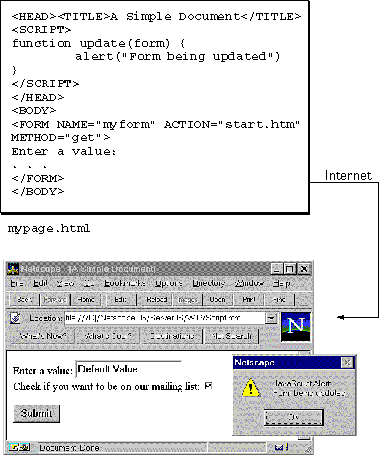 Web browsers such as Netscape Navigator 2.0 (and later versions) can interpret client-side JavaScript statements embedded in an HTML page. When the browser (or client) requests such a page, the server sends the full content of the document, including HTML and JavaScript statements, over the network to the client. The client reads the page from top to bottom, displaying the results of the HTML and executing JavaScript statements as it goes. This process produces the results that the user sees and is illustrated in Figure 1.2.