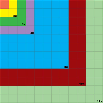 Si tenemos una camara con zoom 2x y la escena que vemos sin zoom está representada por la zona amarilla, podremos hacer una foto a máxima resolución de una zona tan amplia como la naranja. Si el zoom es 3x y la cámara sin zoom nos muestra la zona verde, volveremos a poder hacer una foto a la más alta resolución de la zona naranja. Extrapolando con un zoom óptico 12x, cuando la imagen sin zoom nos ocupe todo el dibujo, podremos obtener a máxima resolución un área tan pequeña como la naranja.