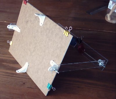 Partimos de una tabla a la que pegaremos cuatro escuadras de doble agujero. Cortaremos en plástico transparente tres tiras de tamaño un poco mayor que el ancho del tablero.