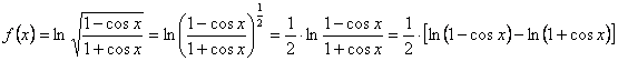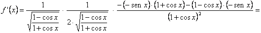 Si, sin fijarnos más, nos “lanzamos” a derivar la función tal como nos la han dado, vemos que es el logaritmo neperiano de la raíz cuadrada de un cociente, y, como tal función compuesta de otras tres, tendríamos:
