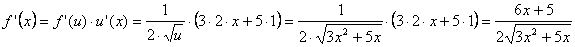 Expresándolo “con palabras”, diríamos que, por ser en principio una raíz cuadrada, su derivada comenzará siendo la unidad partida por el doble de dicha raíz cuadrada; pero todo ello multiplicado luego por la derivada de la función polinómica que estaba en el radicando.
