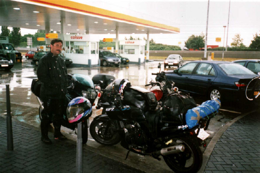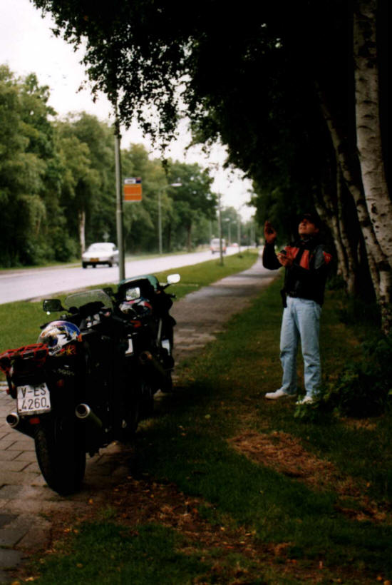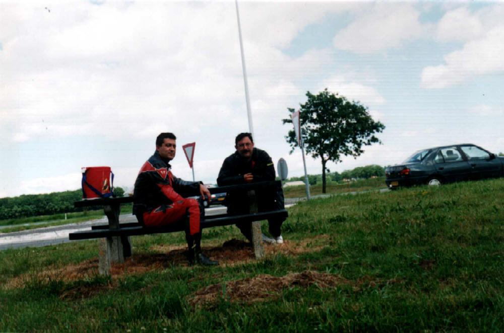 4º Manolo a la altura de Arnhem pinchó la rueda trasera, gracias a un motero holandés que amable nos condujo despacio hasta un taller, después de haber vaciado nosotros dos botes de spray antipinchazos sin resultado optimo.