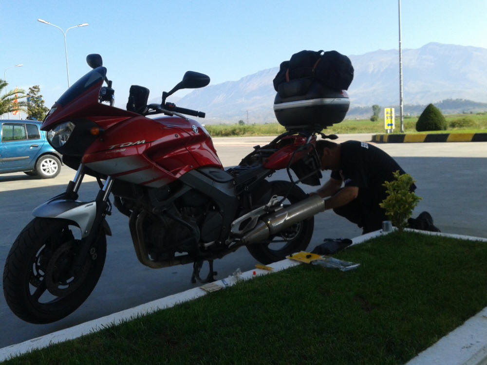 Antes de abandonar Albania la carretera me tenia guardada una sorpresa con forma de pinchazo…, así que manos a la obra…