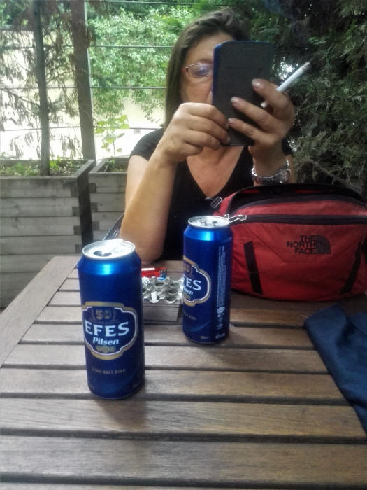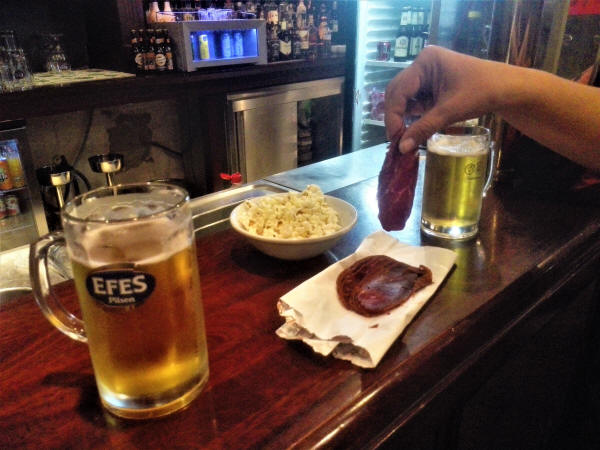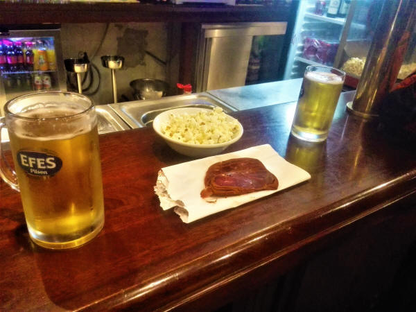 Tuvimos suerte y vimos algunos comercios abiertos donde adquirir la famosa Pastirma, (carne de vaca adobada y secada al aire). Nunca la habíamos probado, así que entramos en uno y compramos 150 g. para probarla, había que ver al vendedor corarla con el cuchillo, ni máquina ni nada, buscamos un lugar con cerveza y nos dimos un homenaje con la Pastirma. Conclusión, nuestro jamón le da mil vueltas y es algo parecida a nuestra cecina.