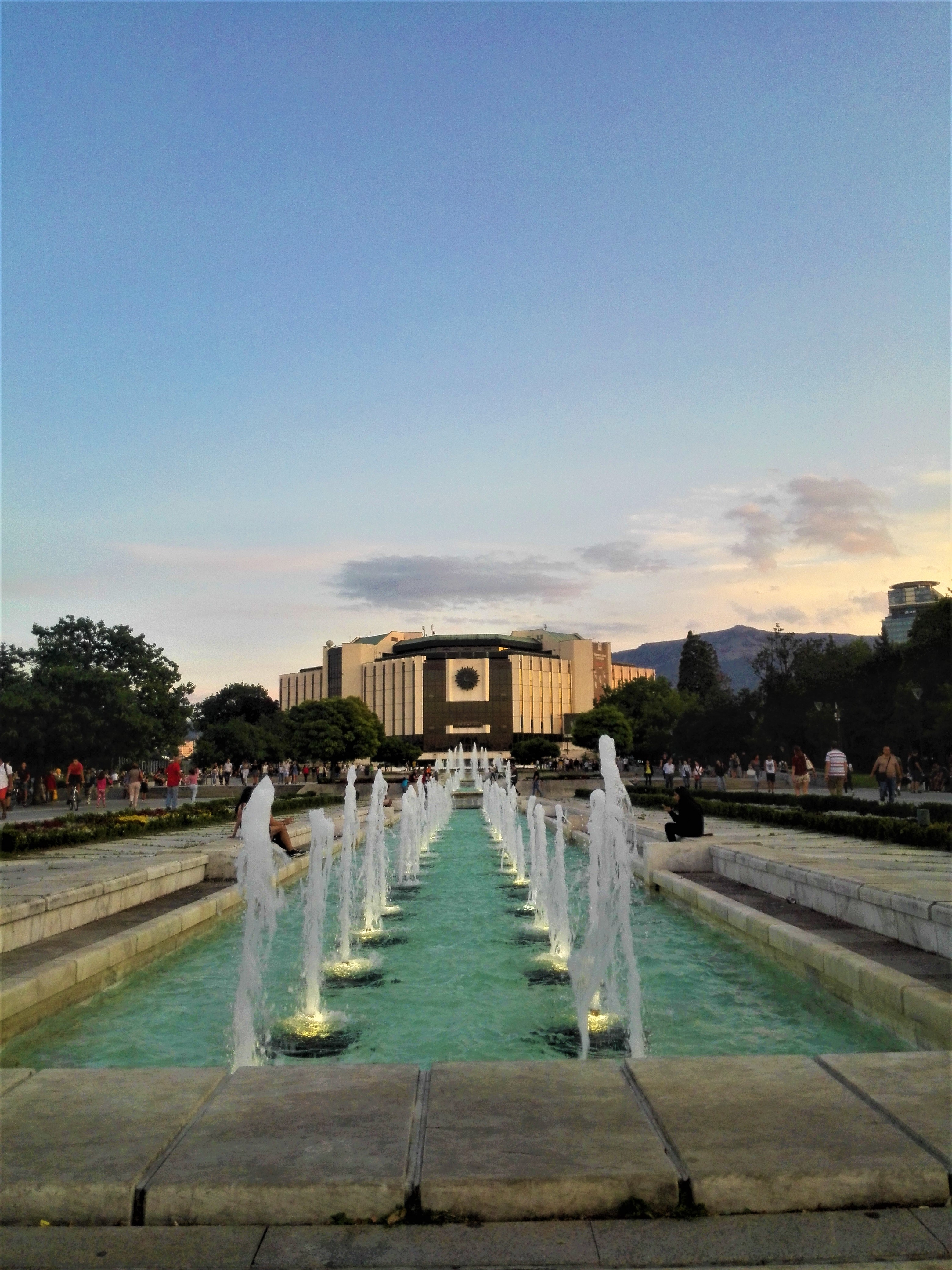 Y al caer la tarde dimos con el animado y peatonal Boulevard Vitosha, donde abundas las terrazas, cafeterías, heladerías y niños corriendo..., al final del boulevard se encuentra el parque que rodea al Palacio Nacional de la Cultura con su magnifica fuente...