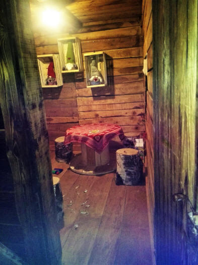 Una casita de madera en el parking ajardinado del hotel donde pueden jugar los niños...