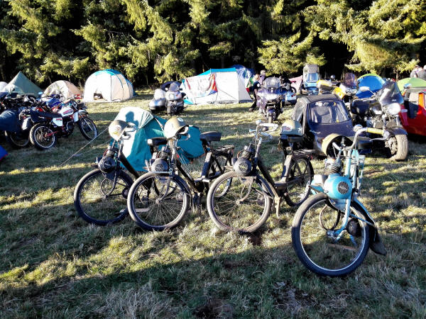 Más despistao que un cerdo en un garaje entro al prado donde hasta no hace mucho pacían las vacas, si no hubiera sido por el jolgorio reinante creo yo que podría haber escuchado las cacofonías en forma de mugido..., por el contrario y a falta de la detección de los mencionados efectos sonoros, sí habían esparcidas una gran variedad de "cacas plastas" en distintos estadios de humedad y consistencia que no impedían para nada el natural desarrollo de la actividad motera.
