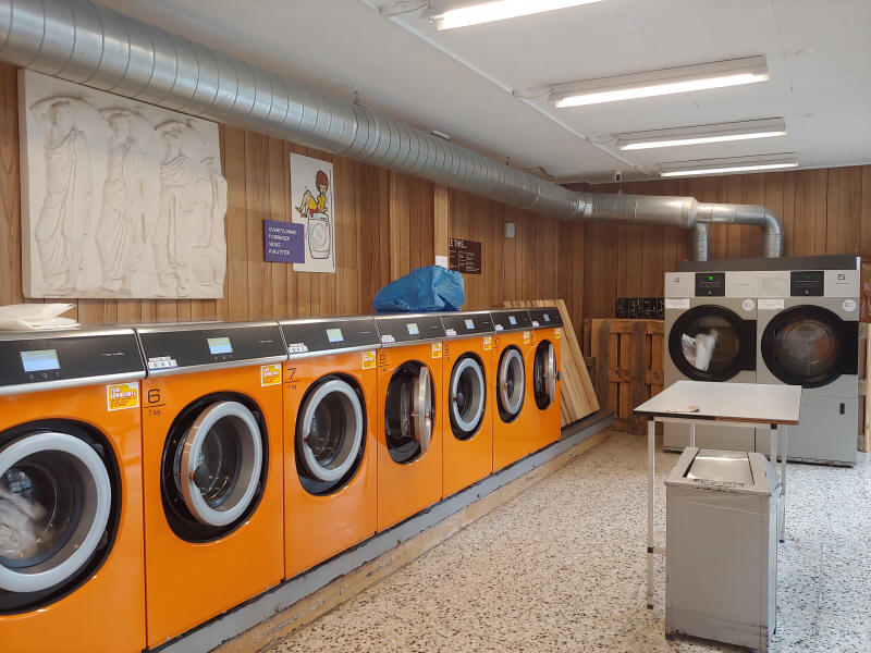 Había que improvisar, llevábamos algo más de una semana de viaje, sería interesante buscar una lavandería y hacer la colada, aquella mañana llovía a mares y el viento era fuerte, la primera lavandería que encontramos no se podía pagar con tarjeta y no estábamos dispuestos a sacar Coronas danesas, buscamos otra y en esta con un sistema algo cutre si se podía pagar con tarjeta.