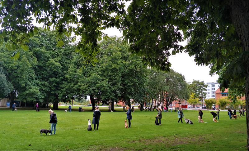 Antes de retirarnos al hotel a descansar, hubo otra cosa del parque que nos llamó la atención, con discreción hice un par de fotos..., un grupo numeroso de personas con perros y un monitor enseñando a comportarse a los animales y a los dueños, la imagen me recordó algo parecido que vi hace años en Francia..., nos pareció un buena idea.