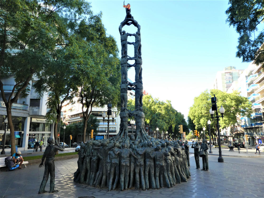 Después de la agradable y deseada comida, con sus respetivos cafés..., volvimos a darnos un paseo, esta vez por la animada Rambla Nova, donde nos encontramos con una estatua dedicada Als Castellers...