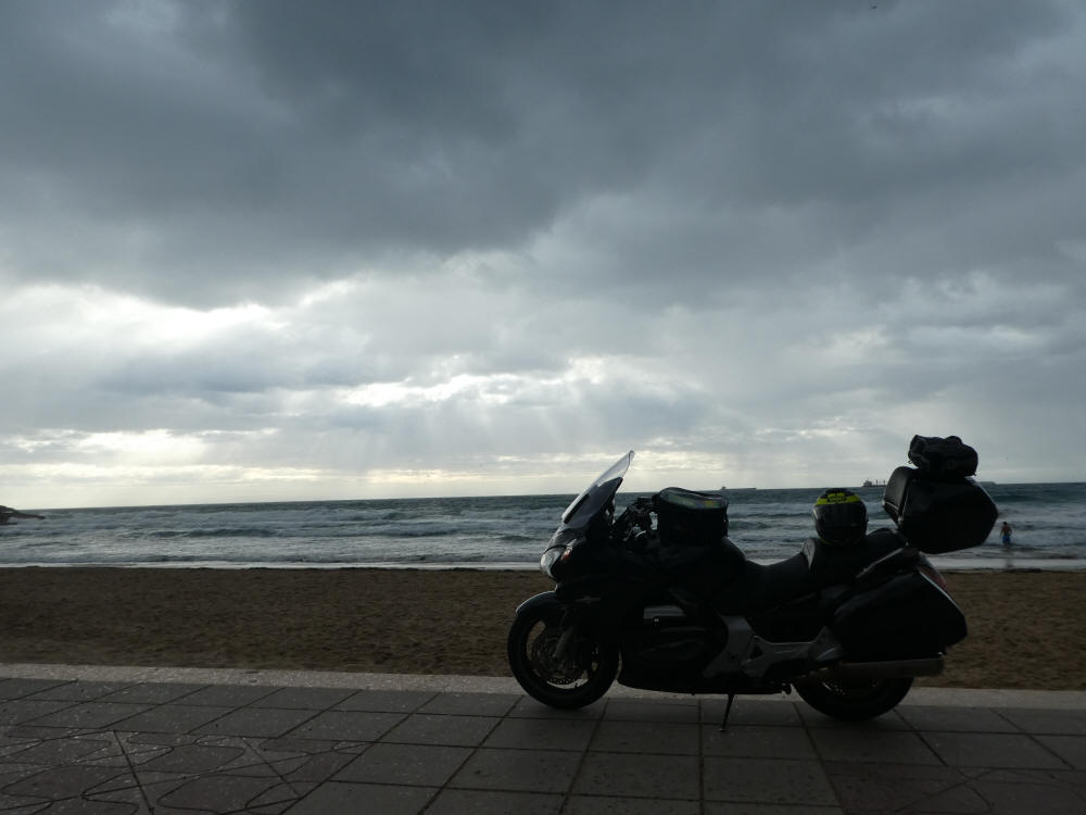 La mañana siguiente en principio sería todo lo contrario hasta ahora..., amaneció nublado y con intenciones lluviosas, mientras Marisa desayunaba aproveché para acercarme con la moto a la cercana Platja de la Arraabassada y llevarme un recuerdo de la moto junto al mar..., en el suelo se pueden observar las incipientes gotas de lluvia que advertían de la proximidad de la tormenta...