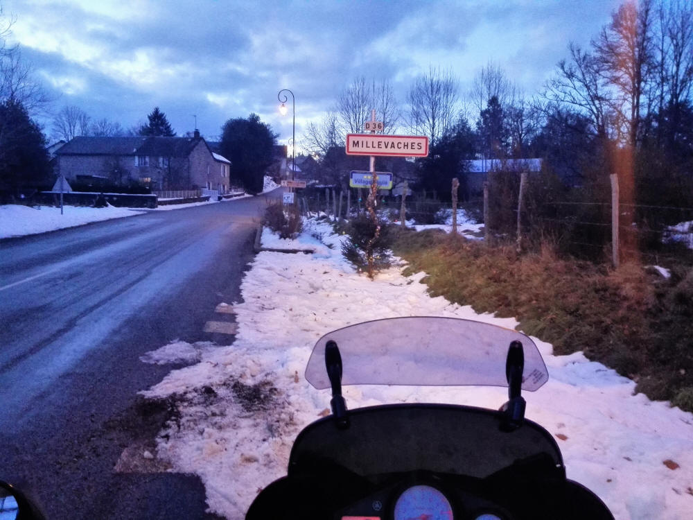 El destino, llegar a Millau, me separan 300 km. de carretera magnifica pero con tramos de muchas curvas..., me animo a mi mismo y me pongo en ello. Pero la carretera no estaba como el día anterior y otra vez Murphy se vuelve a hacer presente "si algo puede empeorar, empeorará" y así fue, las carreteras que me llevaban hacía Millau de vuelta estaban blancas, así que despacito y buena letra y muy alejando de "Plateau de Millevaches", de Meymac, de Ussel, de... a la par que bajando, con lo que la carretera progresivamente iba perdiendo su blanca palidez tornándose en ese gris oscuro que tanto nos gusta, y aunque estuviera mojada el aspecto cambia mucho.