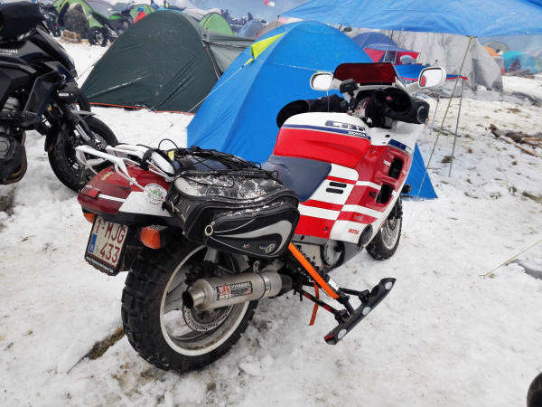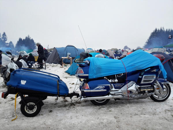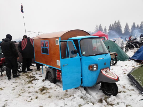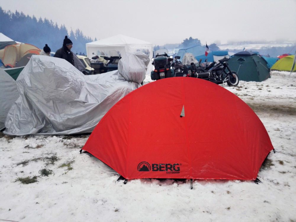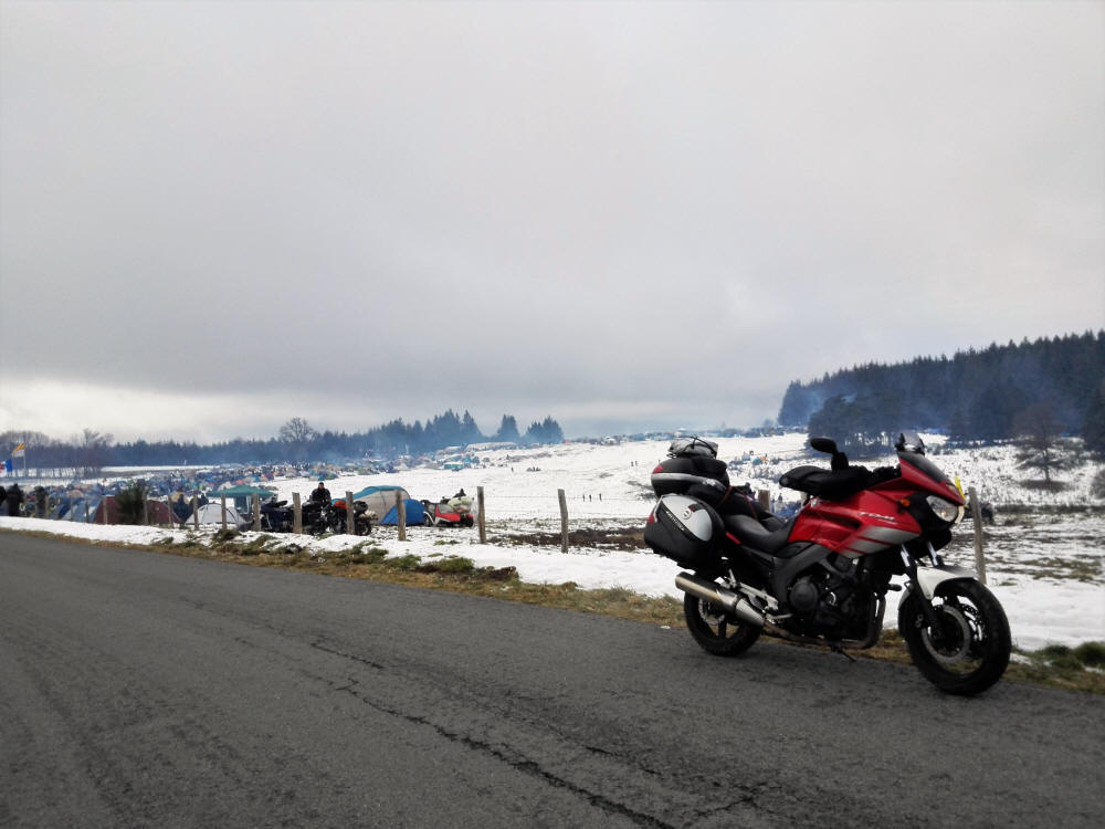 Llego al lugar de la concentración "le Plateau de Millevaches", y entro con bastante dificultad, la entrada embarrada pero helada, resbalan las dos ruedas y a duras penas y no sin dificultad evito alguna caída, busco un lugar rápido para establecerme y no andar buscando, no está el horno para bollos; me sorprende la cantidad de tiendas, motos y moteros que hay concentrados en el mismo lugar que el año pasado a estas horas estaba medio vacío, echo de menos a PedroGuzzi que hizo de "amphitrion" la pasada edición y nos reunió a muchos en un trozo de terreno, -ya los encontraré- pienso y comienzo el montaje de la tienda y establecimiento.