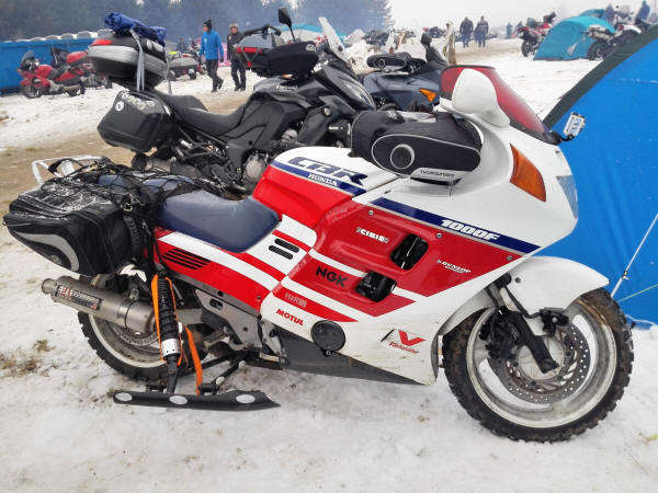 A las 12'00 estaba en orden marcha, me preocupaba que la moto me arrancara, no está la batería en su mejor momento y una noche bajo cero no sé como lo habrá llevado..., joder, al primer toque la TDM arranca sin problemas, la nieve del suelo está congelada con la ayuda de unos franceses logro hacer macha atrás y encarar los 100 m. hasta la salida del "plateau", otra vez los malabares que hice a la entrada y consigo salir indemne de la situación, sin percances..., unas cuantas caídas había visto en las horas que estuve activo por la concentración, caídas sin consecuencias afortunadamente.