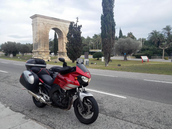 Una parada para almorzar en La Salzadella y disfrutando de las solitarias carreteras del interior de Castellón, buena temperatura y sol, poco después entro en la provincia de Tarragona, el tráfico aumenta considerablemente, pero no tengo prisa y me resisto a salir a la autopista a pesar de los múltiples radares que jalonan las carreteras catalanas. Al paso por el famoso Arco romano de Bara, no puedo evitar para para inmortalizarlo en mi recuerdo con una fotografía...