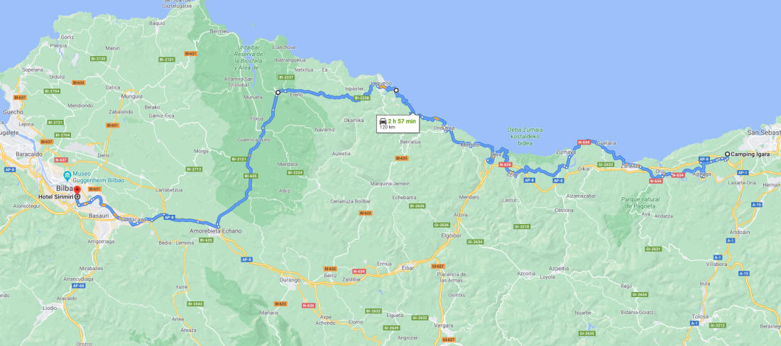 El Camping Igara era nuestro siguiente destino, se encontraba apenas a 4 km. de la ciudad de San Sebastián; dimos con él no sin cierta dificultad el GPS que debía de indicarnos el camino se "raió" en varias ocasiones y la carretera de acceso no era de las más cómodas que sí bonita, también echamos en falta alguna señal del camping en algún cruce próximo...