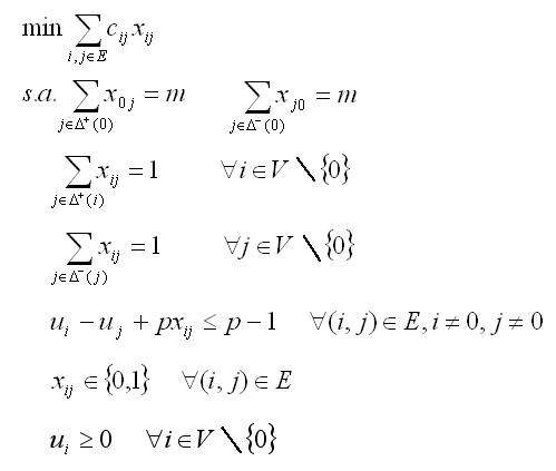 Se trata de m vendedores o viajantes de comercio que debe visitar n ciudades para vender u ofertar sus productos. Cada viajante de comercio podrá visitar como máximo a p clientes o ciudades. Cada par de ciudades puede estar comunicada o no, su distancia se define mediante cij. El problema es por tanto, decidir el recorrido que comenzando por una determinada ciudad { 0 } pase por todas las demás una sola vez y vuelva finalmente a la primera, de manera que se minimice la distancia total recorrida de todas las rutas.