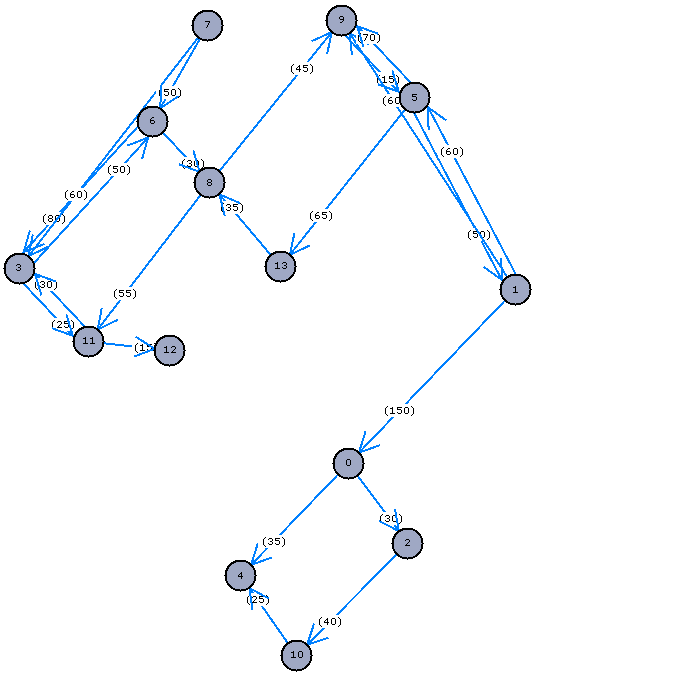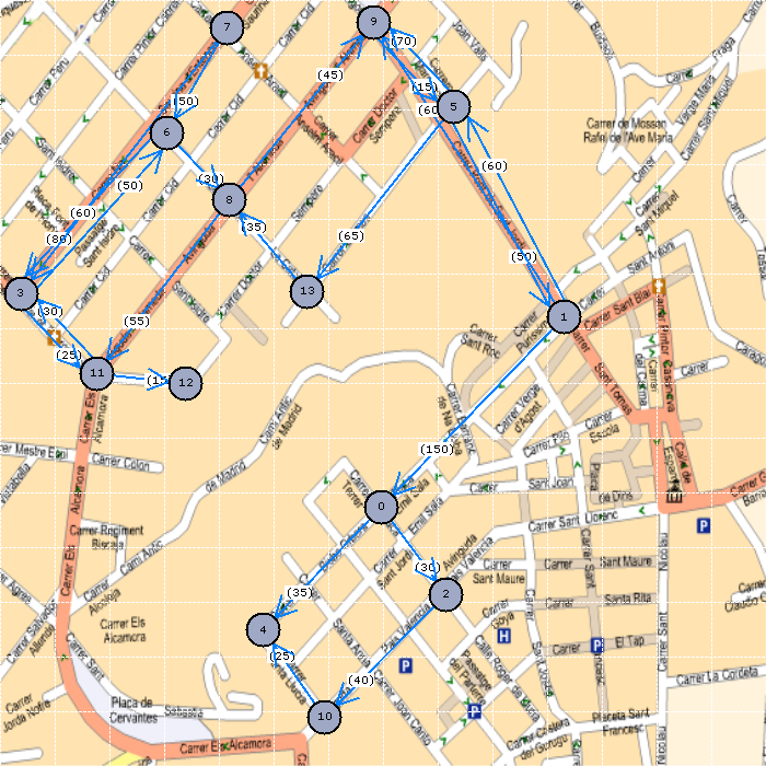 A continuación se puede observar dos imágenes exportadas desde Grafos. En el ejemplo anterior, se trata del grafo de recorridos representado (sin el mapa y con el mapa al fondo).