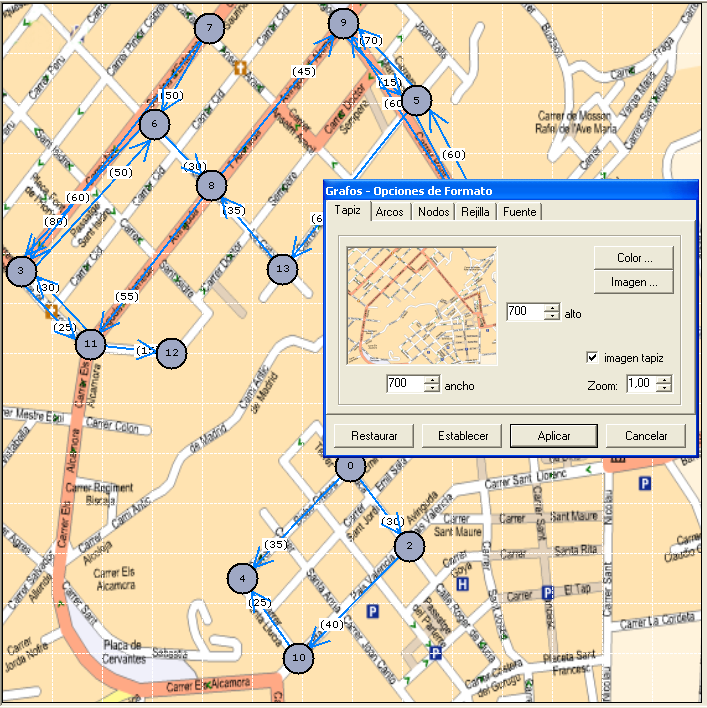 Ejemplo: Una vez que haya construido el grafo, o bien mientras lo construye, pulse la opción de menú Formato/Opciones, aparecerá la ventana de propiedades del grafo. En la pestaña Tapiz, habilite la opción 'imagen tapiz' y después pulse el botón Imagen... para buscar y seleccionar la imagen deseada al fondo. Grafos es posible de leer los formatos: (.gif, .bmp, .png, .wmf, .emf, .tif, .jpg). Después de Aplicar los cambios, la imagen será cargada en el tapiz y ajustada a las dimensiones y escala del tapiz. Si cambia el Zoom o las dimensiones del tapiz, la imagen será nuevamente redimensionada.