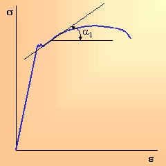 a) Mayor sensibilidad a los alargamientos para el mismo incremento de carga. En efecto, las pendientes a la curva, figura 2.9, son siempre inferiores al módulo de Young, E. E1 = (ds/de)1 << E Û tg a1 << tg a (2.7) b) Los alargamientos conseguidos son remanentes, es decir, no se recuperan cuando cesa el esfuerzo, como se muestra en el punto c del desarrollo. Ambas características se cumplen en todo el campo de tensiones superiores al límite elástico lo que significa la denominada zona plástica. |