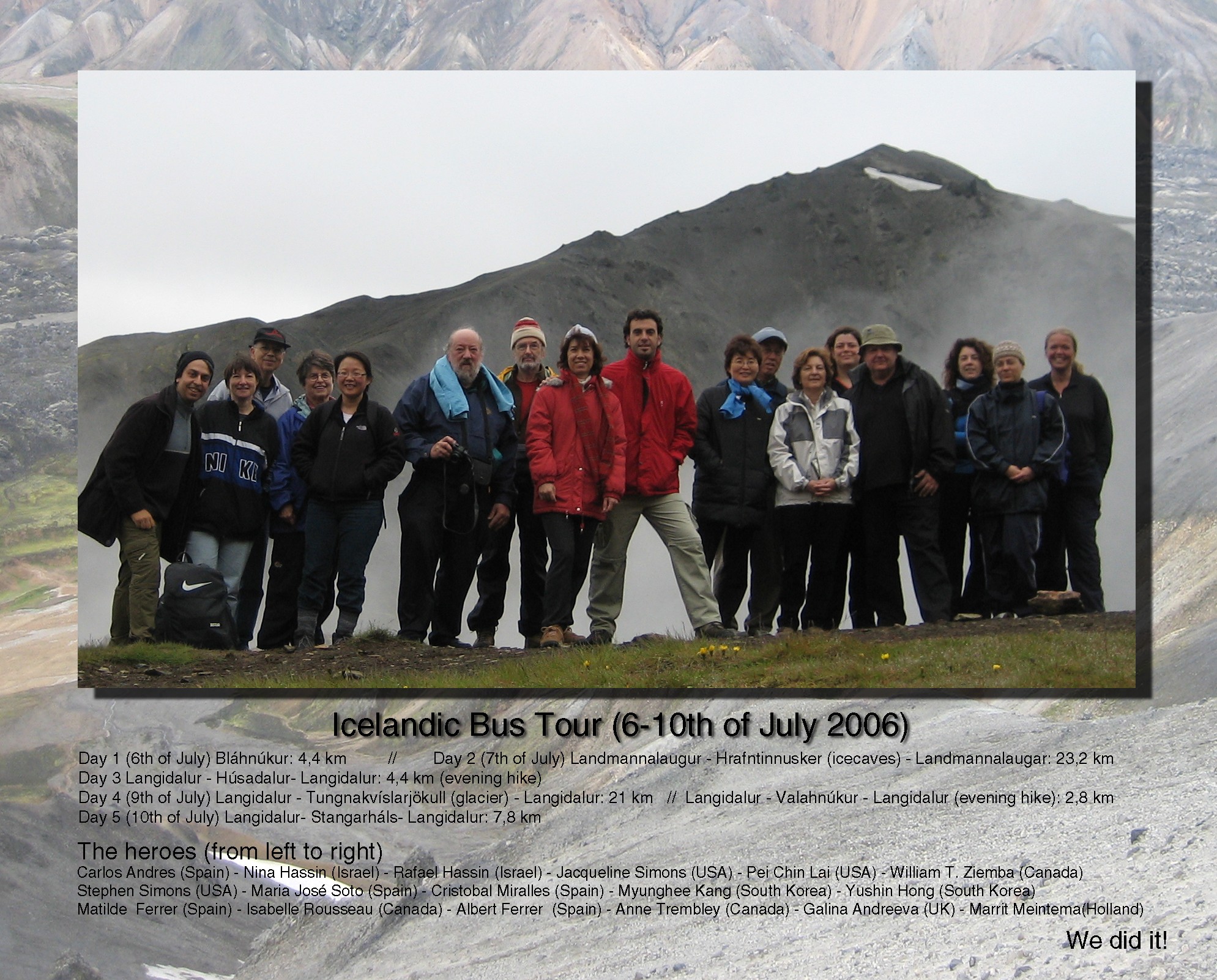 EURO 2006. With the "Bus" tour (at the end we walked more than 50 Km in 4 days). Near Landmannalaugar hut. The names of the "heroes" are attached.