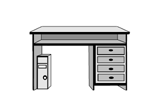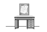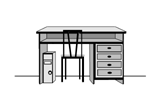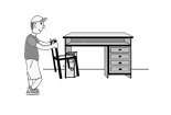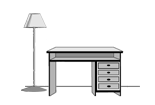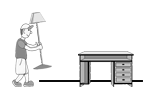 neben: Peter stellt eine Stehlampe neben den Schreibtisch.