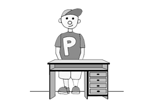 Peter se coloca detras del escritorio.Peter steht hinter dem Schreibtisch.