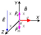 Un electrón moviéndose en este dispositivo se encuentra sometido a dos fuerzas, la fuerza eléctrica (observa que la carga del electrón es q = -e),