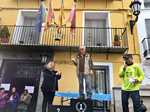 Enguera, sábado 23 de abril, autoridades locales y público entregado reciben a las hermanas Susana y Alicia, flanqueadas por un caballero noble, Paco.